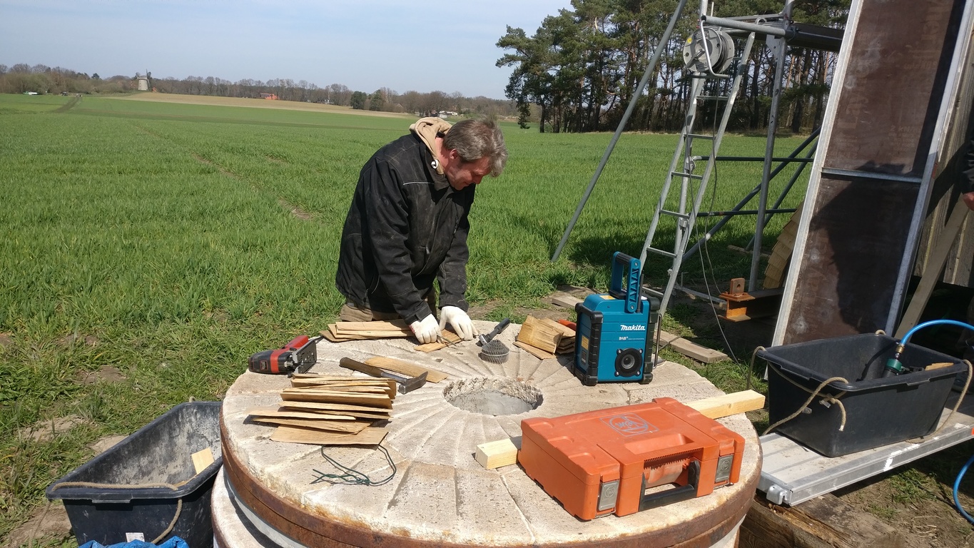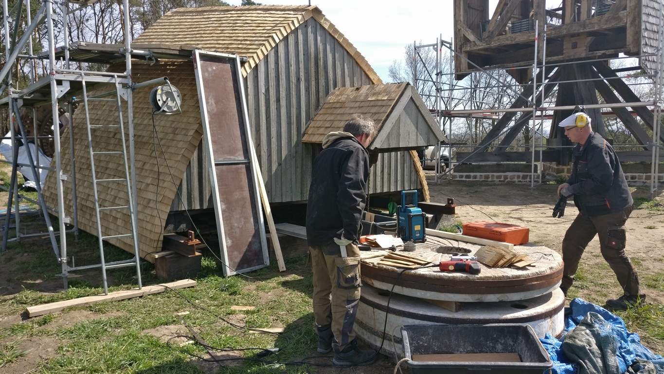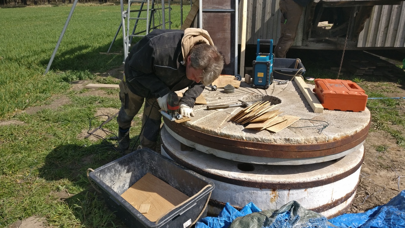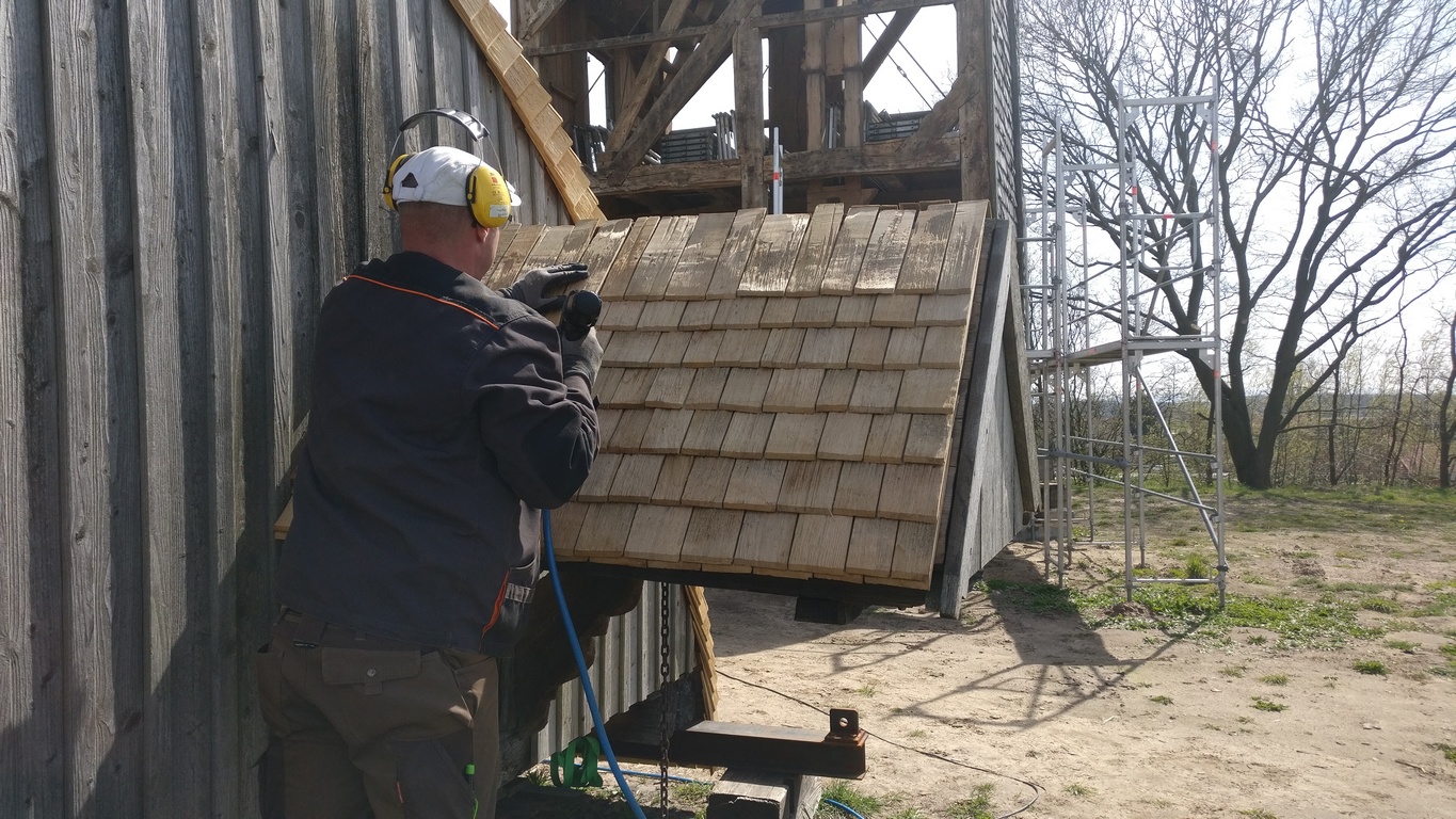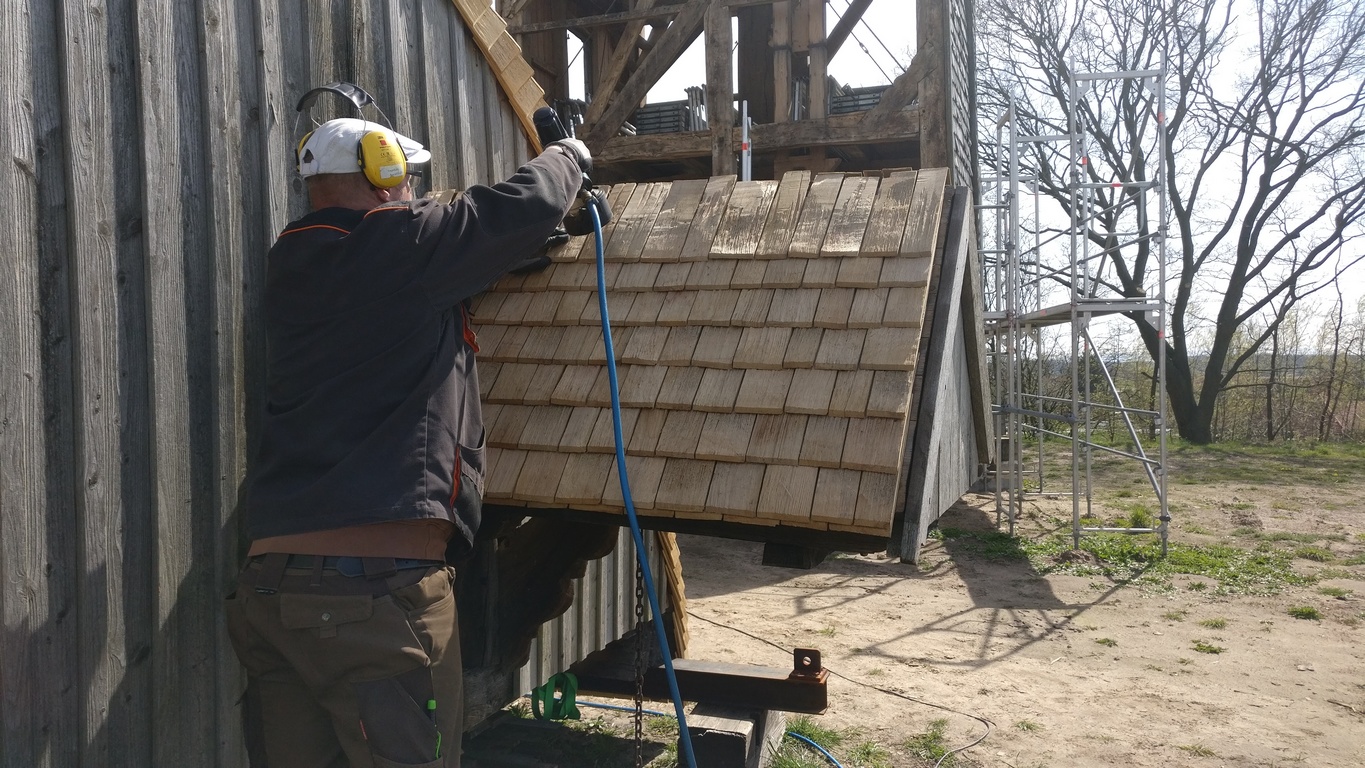 An dieser Stelle zunächst ein ganz großes Lob und herzlichen Dank an die Mitarbeiter des Mühlen-Bauhofes für das engagierte und kompetente Wirken an der Bockwindmühle Neuenknick. Wie man auf den Bildern unten sehen kann, wird jede einzelne Schindel auf Maß angefertigt.