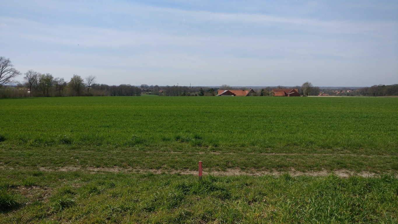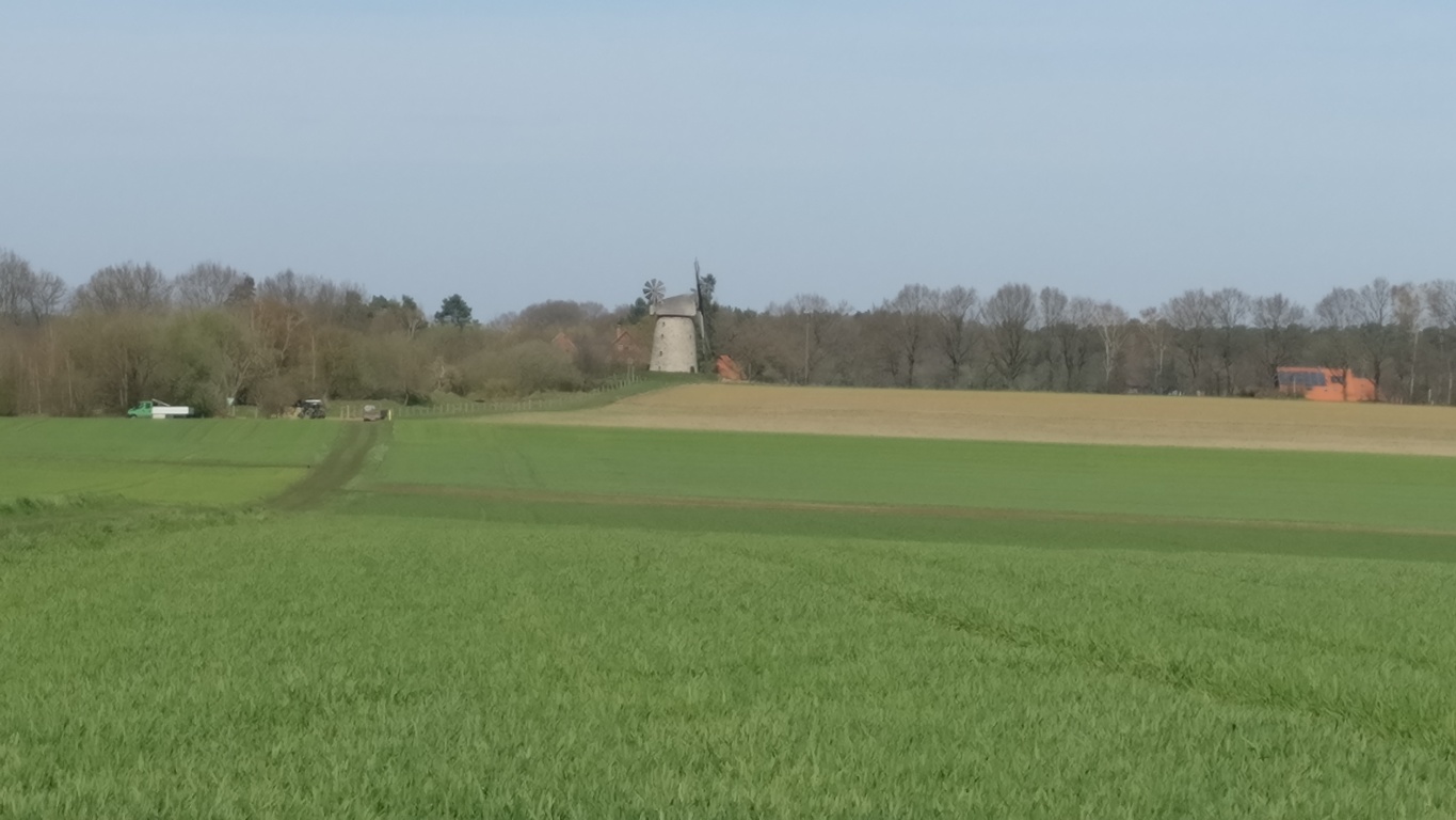 Der Blick von der Bockwindmühle Neuenknick in Richtung Norden. Auf dem Bild zu sehen ist unter anderem die 800 Meter entfernte Königsmühle in Seelenfeld.